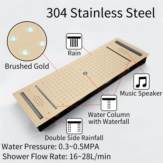 Fuse | 36" In Dual Showerhead Complete Led Music Shower Set 6 Body Jets 2x Wall Mounted Rainfall Showerhead - BRUSHED GOLD is backordered and will ship as soon as it is back in stock.