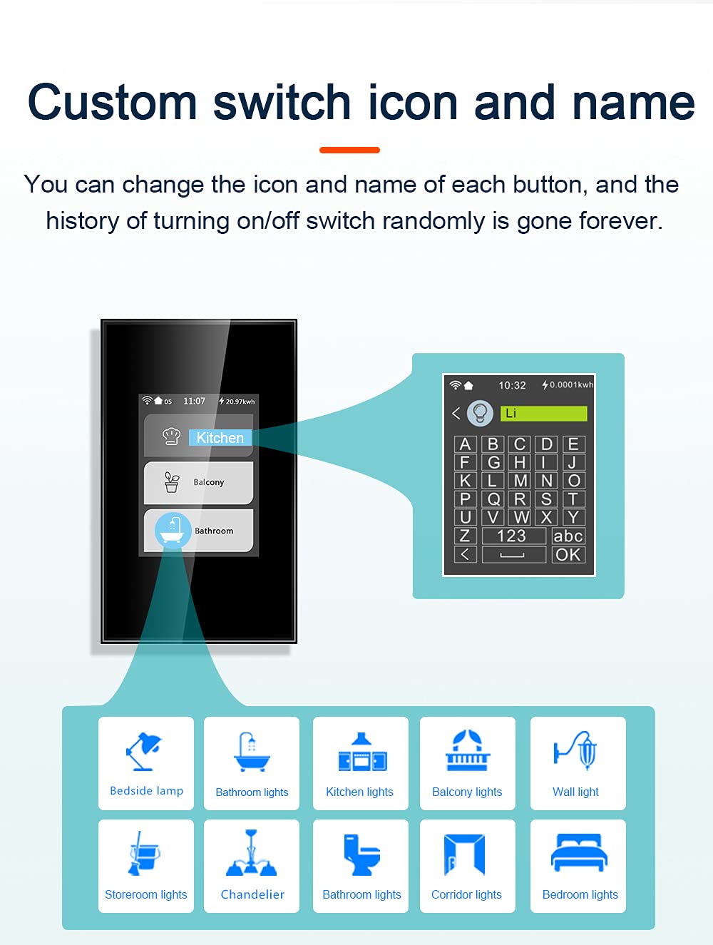 Set the switch button icon and name on the smart switch, Easy to find out the right light and control. Replace the traditional switch which uses a sticker to identify the button.