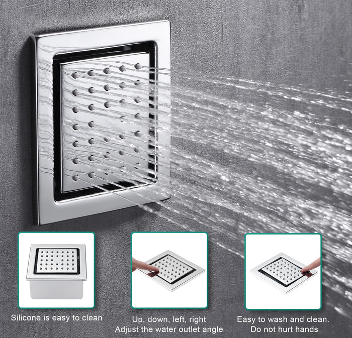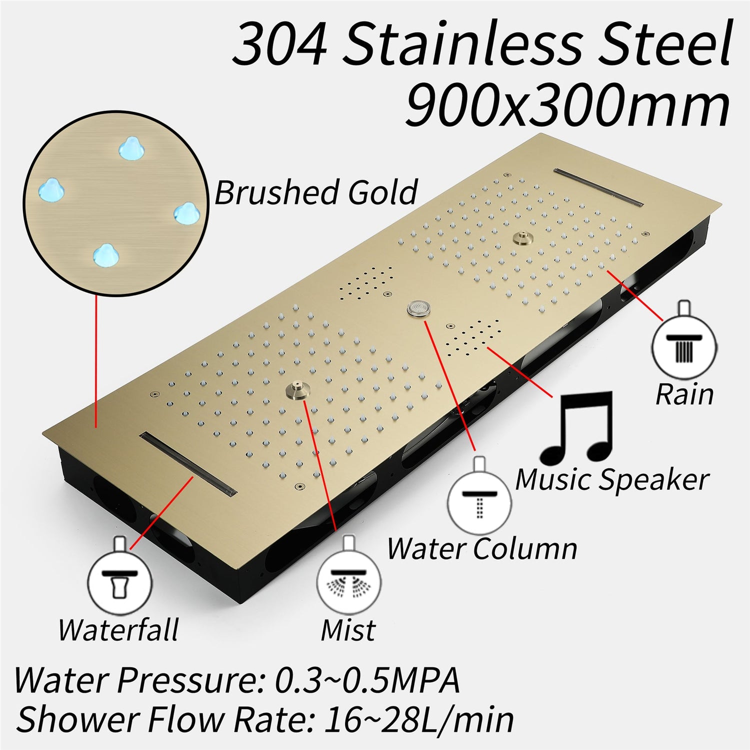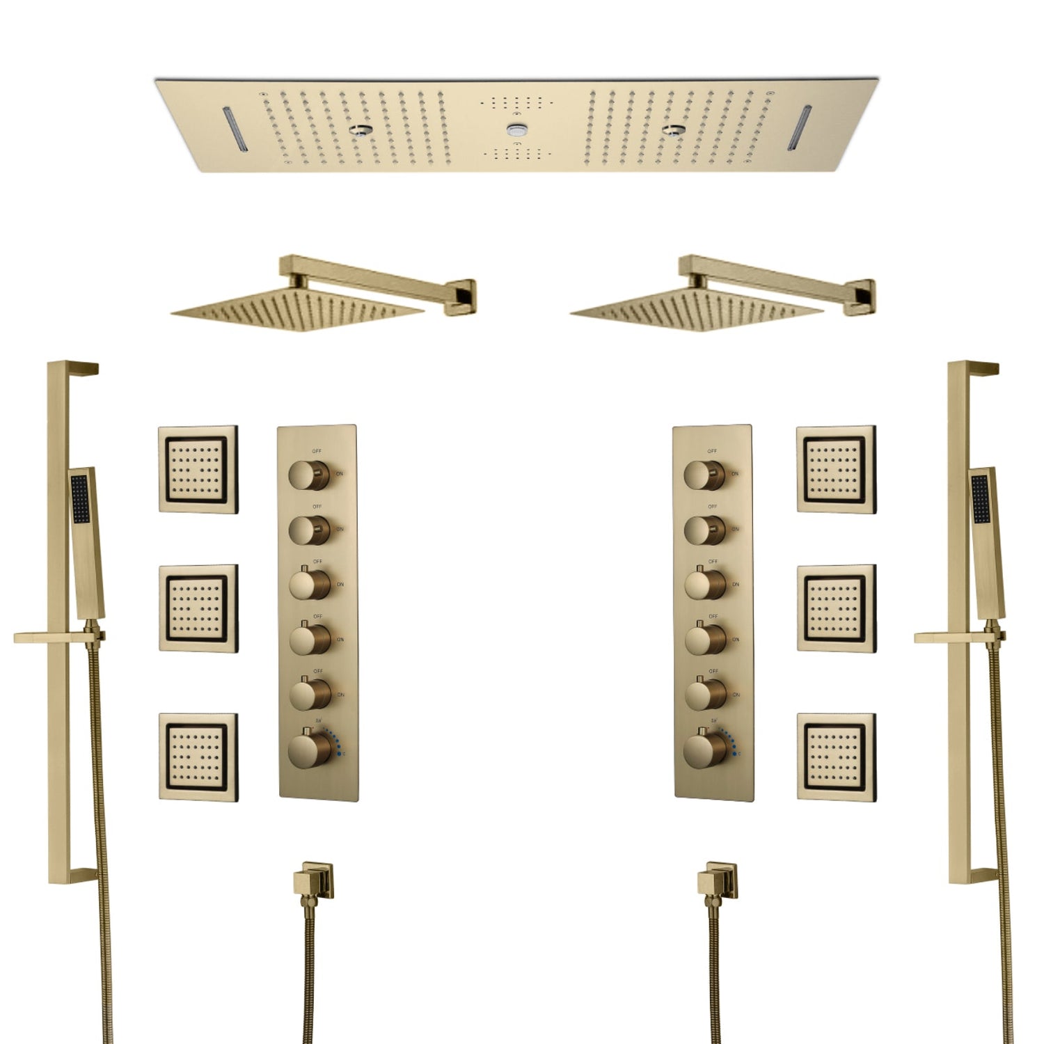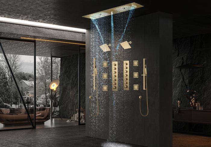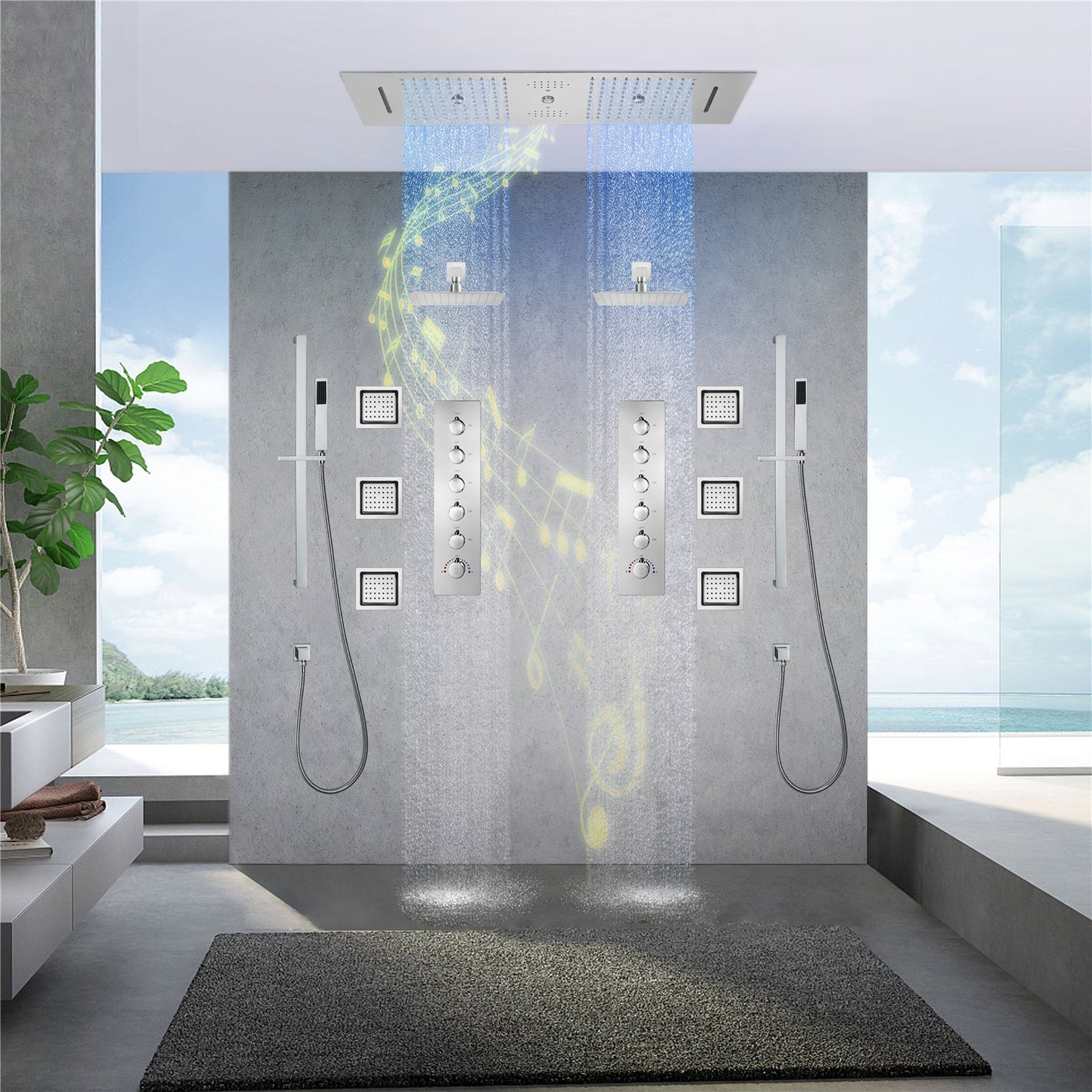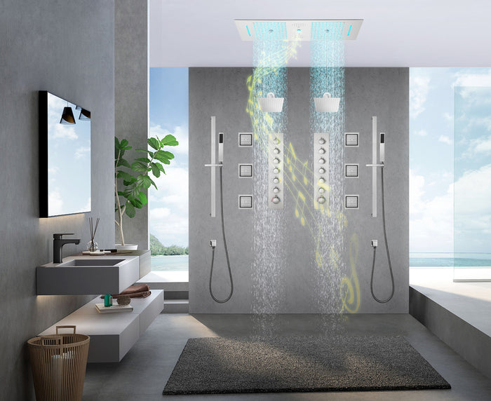 New design Luxury customized complete LED music shower system for large luxury master bathroom , hotels presidential suites , custom home , etc. will fill your space with large 36" ceiling mounted music LED shower head and two wall mounted 10 inches rainfall showerhead plus 6 body jets spray 2 hand held spray with slide bars.
