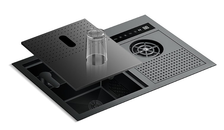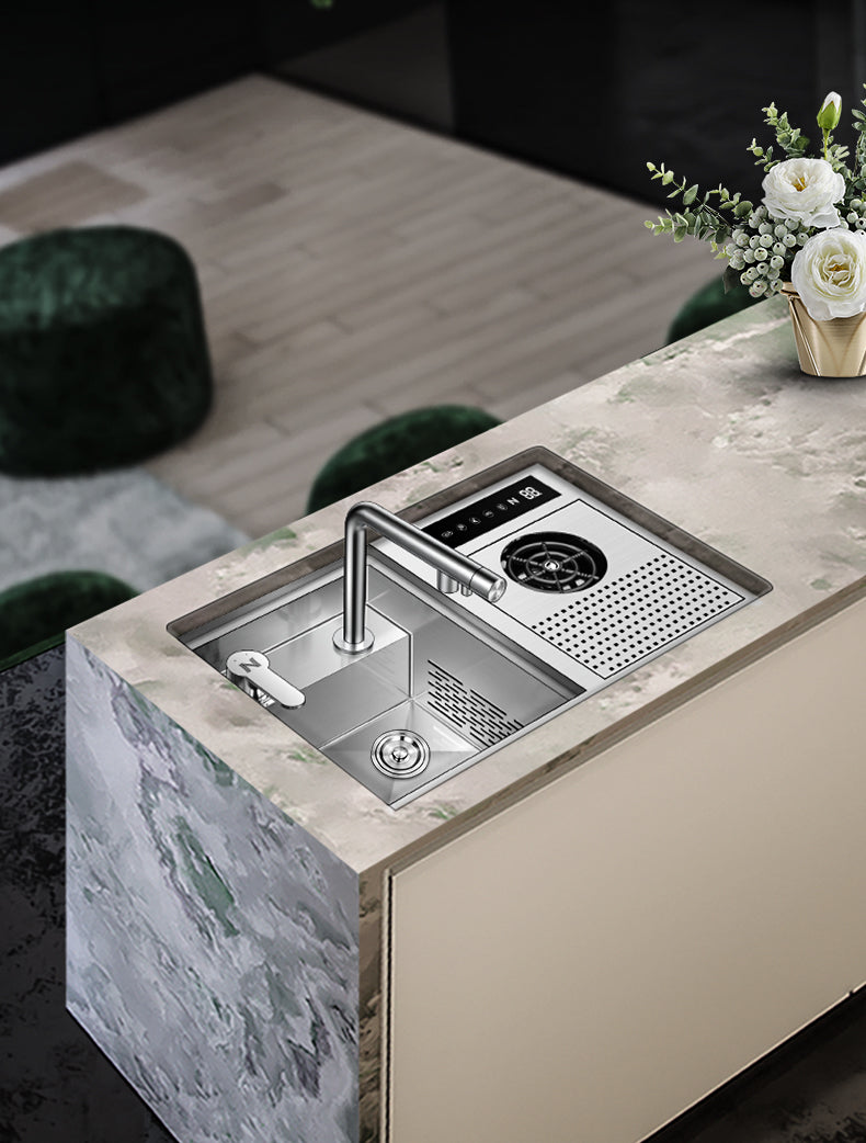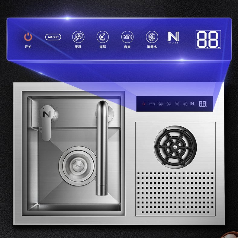 304 Stainless Steel rectangular shape 21.6"in X 14.5"in complete work station kitchen sink cup rinser and hydro purification sink using Hydro water ion cleaning technology for fruits , vegetable and sea food removing pesticide and hormone residues.