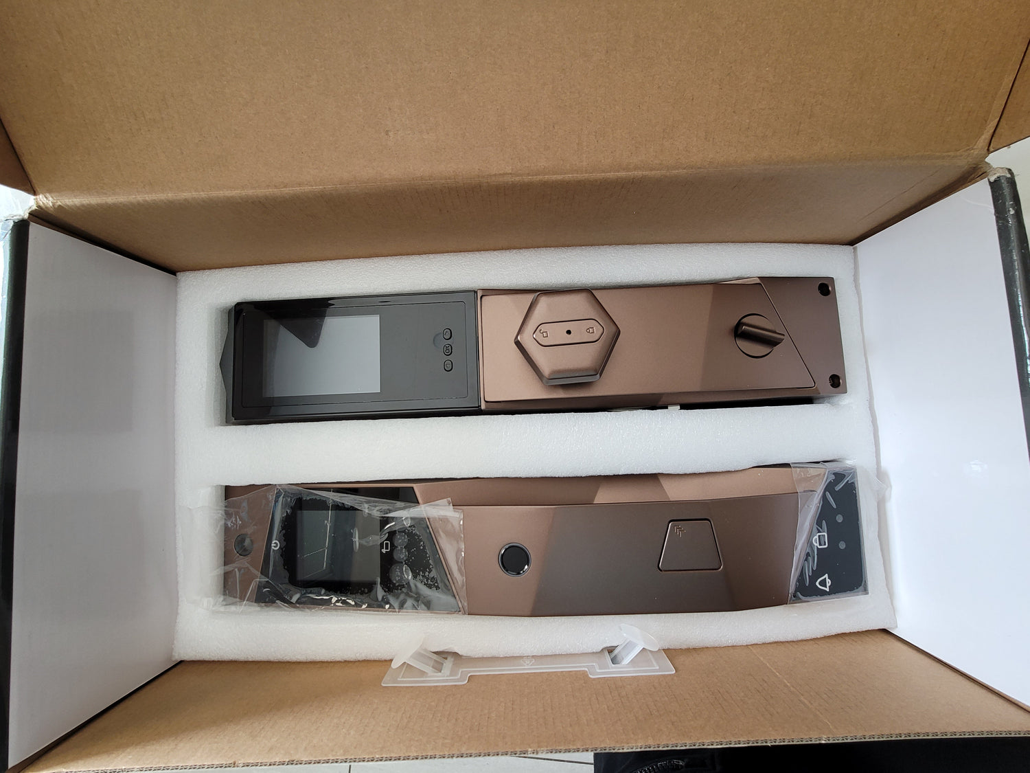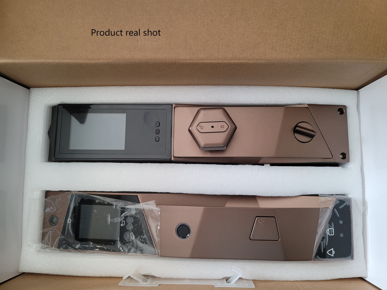 A smart door lock with Wi-Fi connection and fingerprint sensor, face & palm scan recognition features , Camera and 4.5" HD Screen no need for spy eye on your door Built-in Doorbell when guest push doorbell you will get phone notification with snapshot of the visitor pressed the doorbell, the App will give you 30 seconds to unlock or to ignore. This smart keyless entry door locks come in two colors Grey and Red bronze.