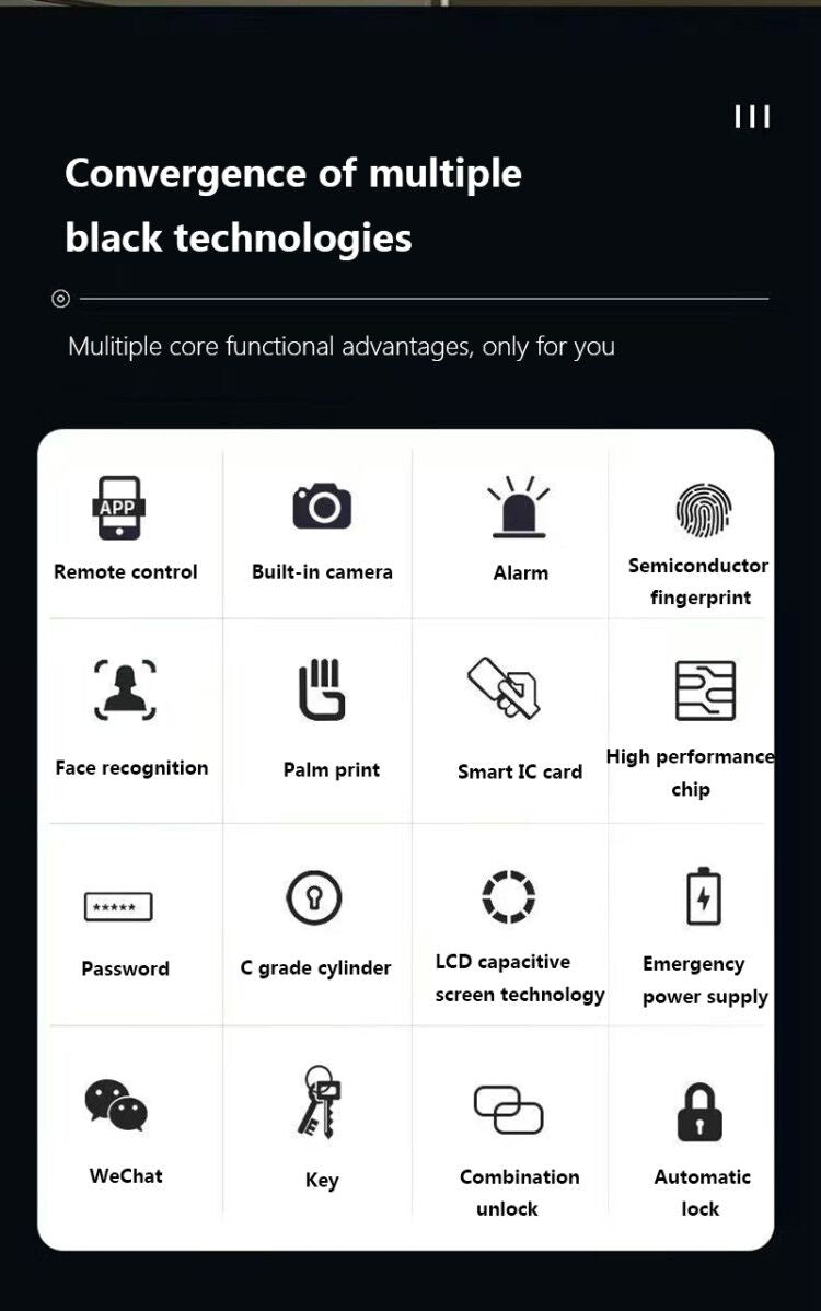 - Unlocking : Unlock: Face recognition, Smart Phone App remote unlock, palmprint, passcode, fingerprint, card & key.